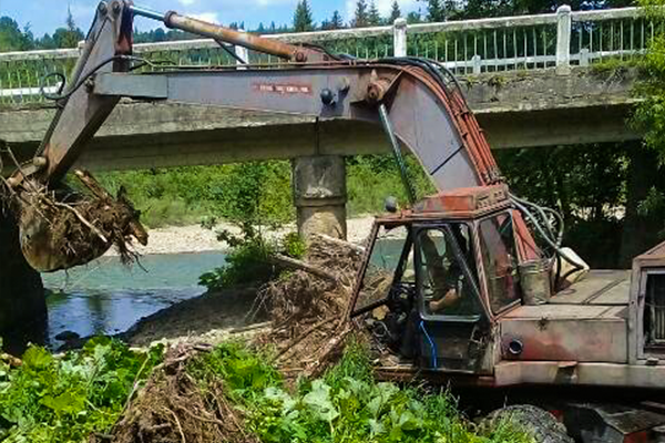 Русло річки під мостом у Розтоках Вижницького району, розчищають дорожники. Як повідомляє служба автомобільних доріг у Чернівецькій області, роботи тривають на шляху дороги Р-62 «Криворівня – Усть-Путила – Старі Кути – Вижниця – Сторожинець – Чернівці».