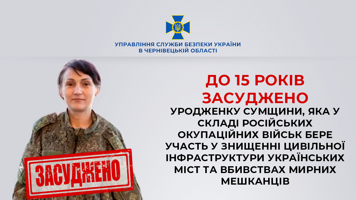 За доказовою базою СБУ Шевченківський районний суд м. Чернівців визнав винною і засудив до 15 років в’язниці уродженку Сумщини, яка у складі російських окупаційних військ бере активну участь у захопленні українських територій.