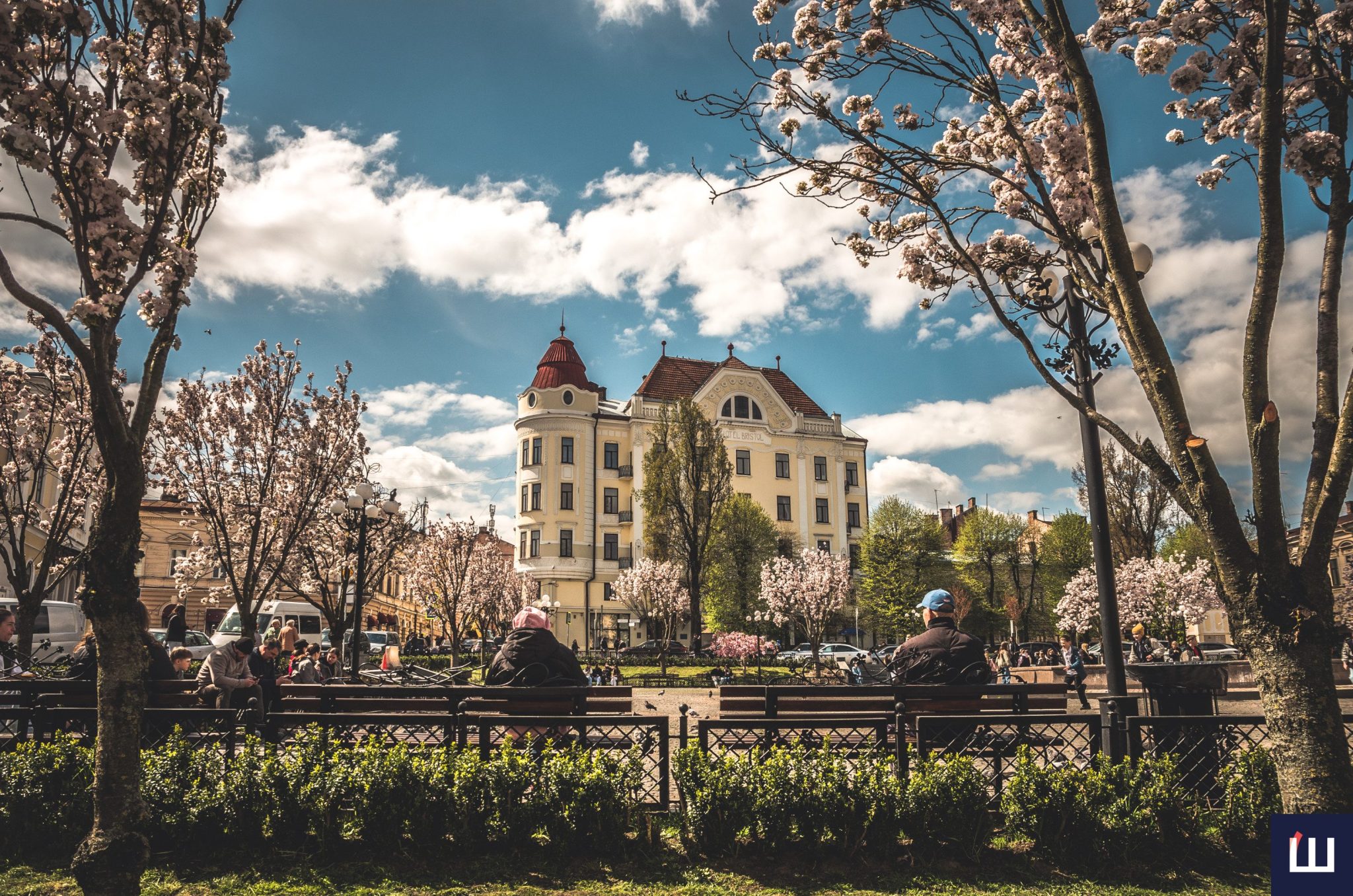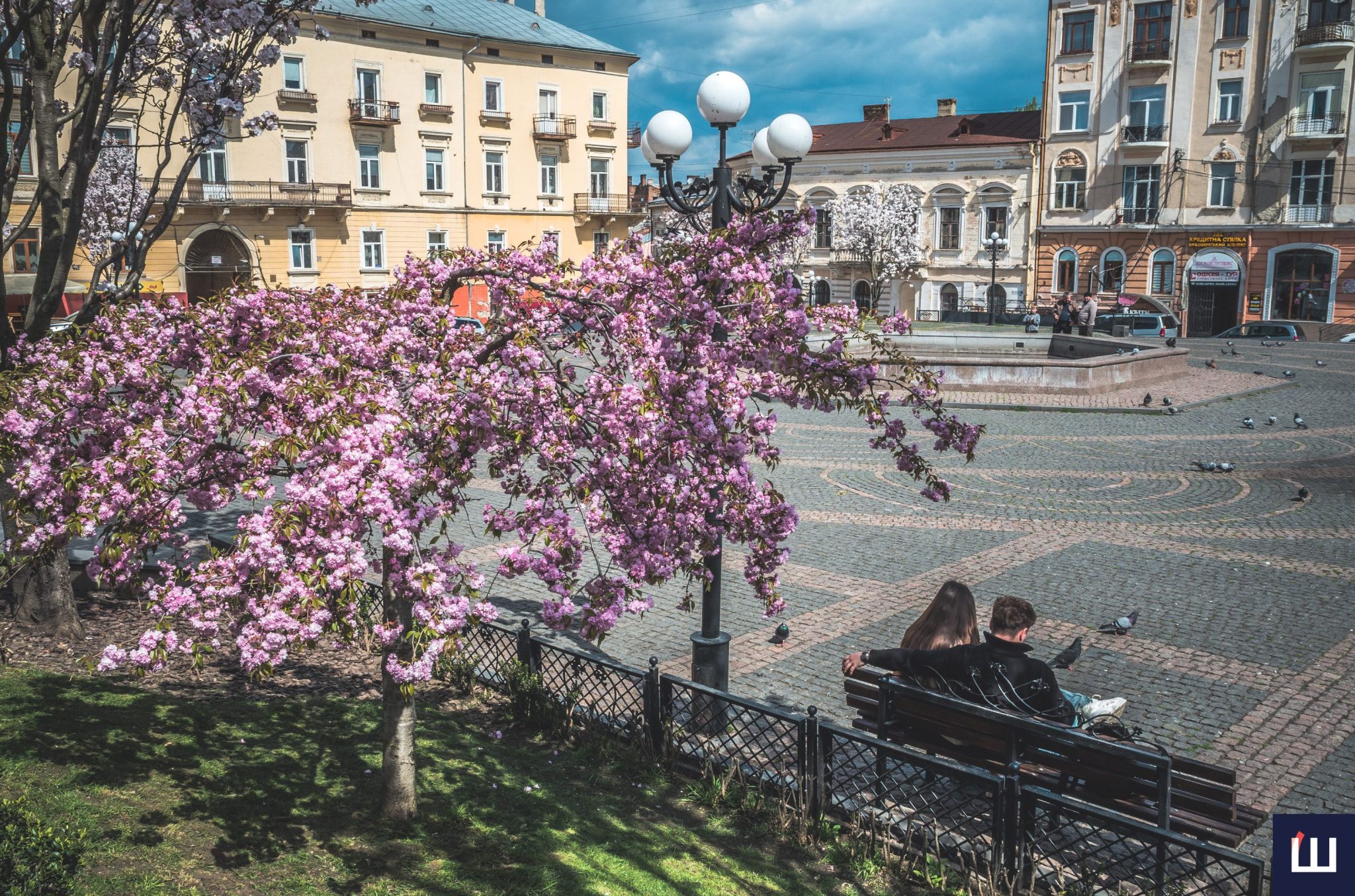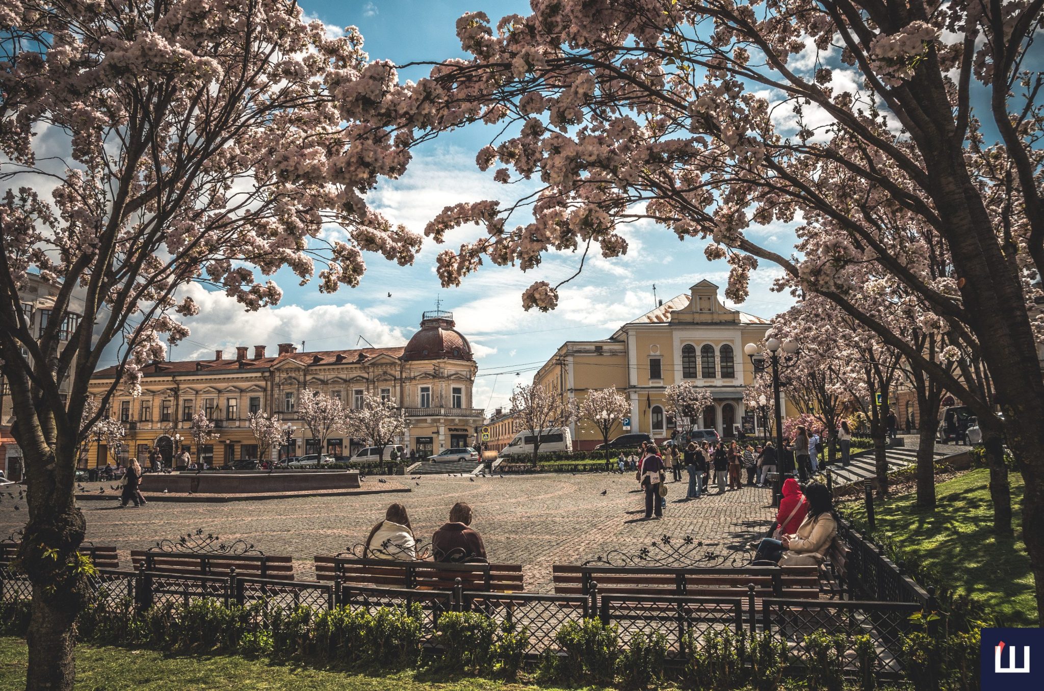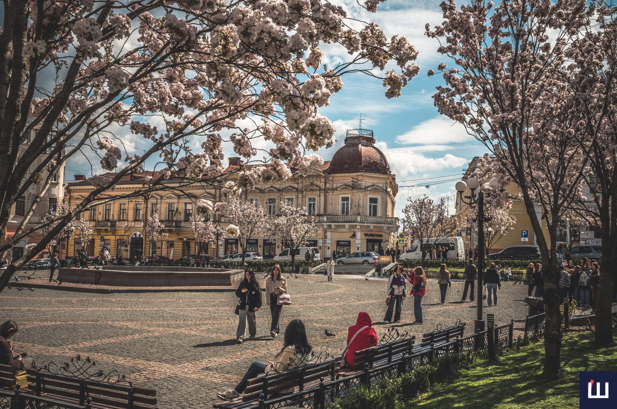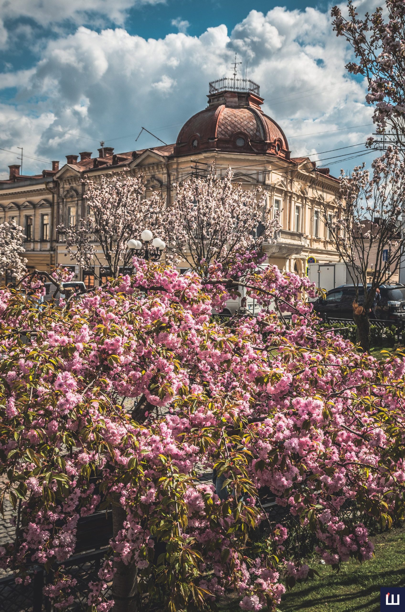 На площі Філармонії у Чернівцях розквітли сакури — ніжні рожеві крони перетворили локацію на одну з найатмосферніших у місті. Дерева вкрилися густим цвітом, приваблюючи містян і туристів, які приходять сюди зробити світлини та просто відчути весну.