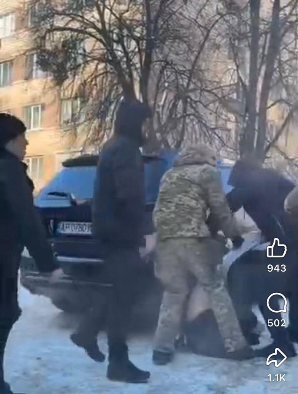 На кадрах відео видно, як невідомі у балаклавах та ймовірно представники ТЦК намагаються силоміць посадити чоловіка в автомобіль.