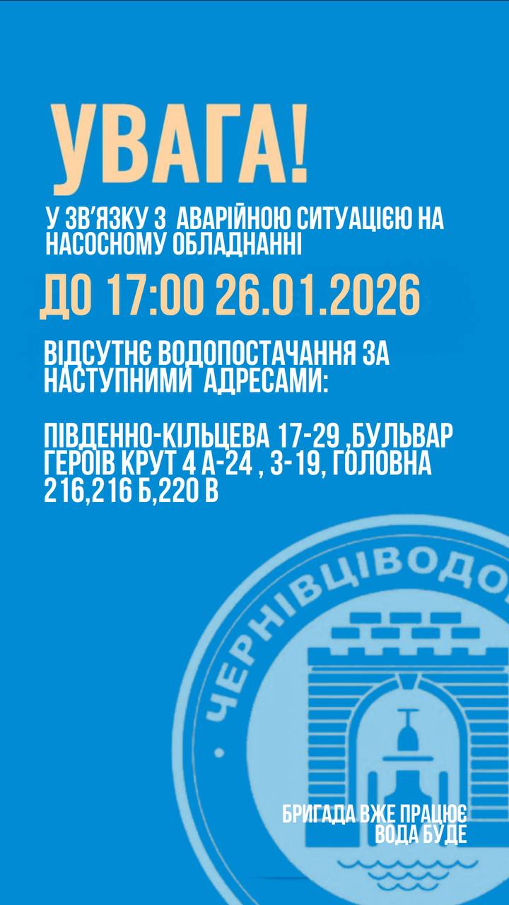 У Чернівцях у зв’язку з аварійною ситуацією на насосному обладнанні до 17:00 26 січня 2026 року призупинять водопостачання за низкою адрес.