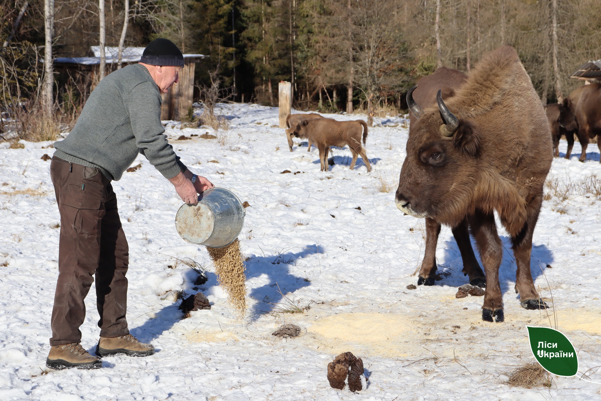 Сергій Чистов, працівник лісництва з 1976 року, щодня підгодовує зубрів. За його словами, у морози тварини більше рухаються і потребують більше калорій, а в сонячні дні обирають південні схили для прогрівання. Їдять зубри овес, кукурудзу крупного помолу, сіно, а також суху траву та опалі гілки дерев.